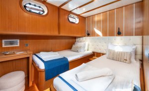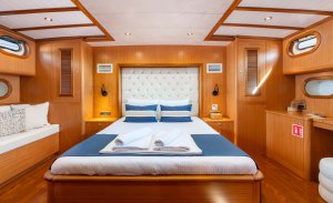 Gozdem The One, which is in the Luxury gulet class, offers a comfortable travel experience with its modern structure built in 2022, with a capacity of 6 guests. With a total of 4 cabins, including 2 master, 1 double and 1 twin cabins, each equipped with a shower and WC, it provides comfort to its guests in every detail.